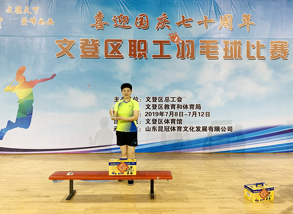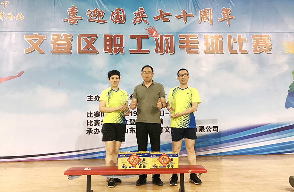 7月11日,喜迎国庆70周年全区羽毛球比赛各单项赛全面结束,我公司营销服务部侯龙洋斩获企业组男子单打亚军,质量管理部王艳艳荣获企业组女子单打季军。侯龙洋还将代表企业组参加全区总决赛,向代表文登区参加全市比赛资格发起冲击。公司工会副主席刘华到场为他们加油助威。