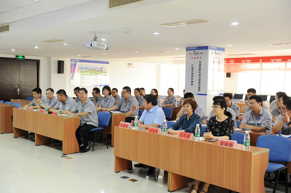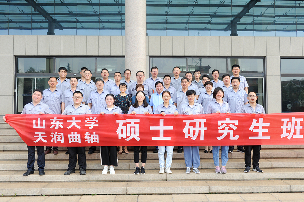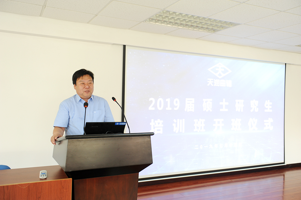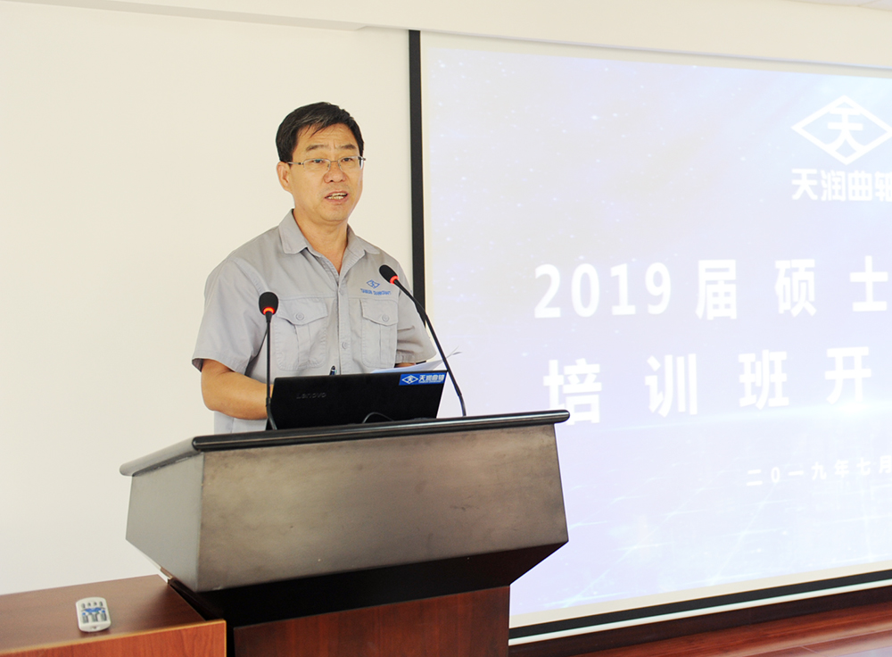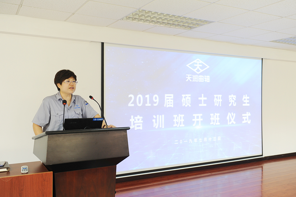 7月13日8点30分,山东大学和天润曲轴股份有限公司联合举办的天润曲轴2019届硕士研究生培训班在公司电教室隆重开班。山东大学机械学院党委书记仇道滨、老师吕巧娜、孙玲玲,公司常务副总经理周先忠、党委副书记刘红福、技术类首席专家孙军、总经理助理夏丽君、企业管理部副部长张军、职业学院副院长邵忠伟以及培训班26名学员出席本次开班仪式,总经理助理夏丽君主持本次开班仪式。